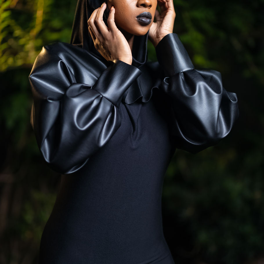 This unforgettable silhouette pairs a sculptural faux leather shoulder detail with intricate long sleeves, featuring a refined open-sleeve design that whispers seduction and strength. The body of the dress is made from a breathable, 4-way stretch bamboo knit that contours with your form, offering both luxurious comfort and a striking, curve-hugging fit.