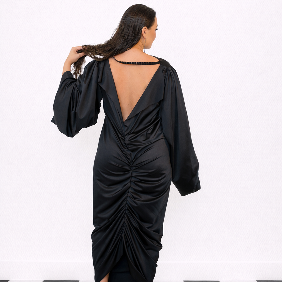 The Shadow Muse Gown is a poetic fusion of mystery, power, and sculptural grace. Crafted in liquid black satin, this gown embraces the body in fluid drape while commanding attention through its exaggerated batwing sleeves and sinuous silhouette. The back reveals a deep plunging V framed with a delicate rhinestone neckline, balancing drama with refined allure. Every fold and curve of the gown captures light and shadow — a wearable ode to strength wrapped in softness.