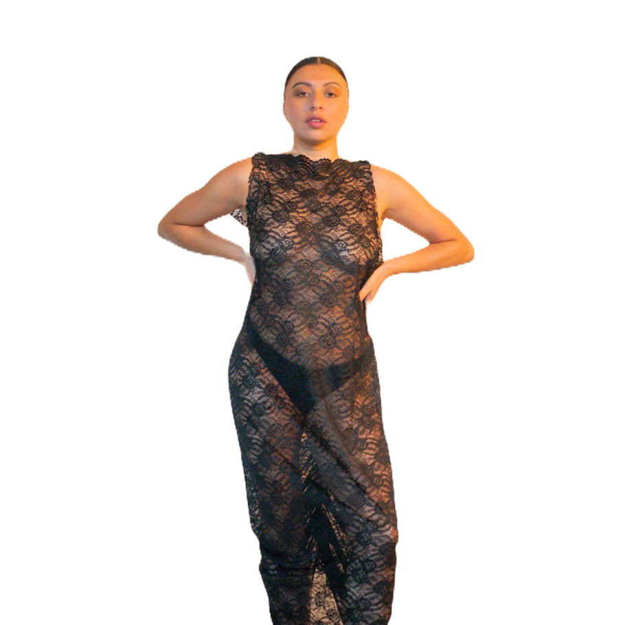 The Veiled Reverie Gown is a poetic expression of dark romance and sensual transparency. Crafted entirely from intricate black floral lace, this gown balances delicacy and defiance. The high neckline adds a touch of vintage refinement, while the open, plunging back and gathered detailing at the lower spine create an alluring modern silhouette.