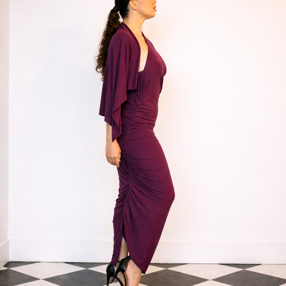 The Élise Asymmetrical Ruched Gown is a fluid celebration of modern elegance, sculpting the body with effortless drape and intentional asymmetry. Crafted in a rich plum stretch-lux fabric, the silhouette clings and cascades in perfect harmony, offering movement, softness, and dramatic presence.
